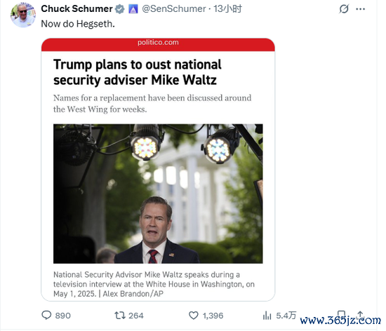 消息传出后,美国前民主党副总统候选人、明尼苏达州州长沃尔兹在社交媒体上调侃:“华尔兹已离开群聊。”美国会参议院少数党领袖、民主党人舒默不仅转发华尔兹将被解职的相关报道,还附文“现在轮到(国防部长)赫格塞思”了。泄密事件曝光后,民主党人频频呼吁华尔兹、赫格塞思等涉事高官辞职。